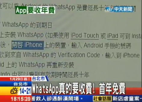 第四,某軟體、某服務,要收費,這是天經地義的,這個跑馬燈字幕,零分! 使用者付費這五個字,應該夠直白了吧? 對我而言,這個標題,就跟"XX新聞記者,真的要領薪水!",一樣的意思。怕各位不懂,痞子在解釋得更簡單一點,Whatsapp就像是國道一號,你的訊息就像是乘客,你花了大錢買車子(就是手機),要把訊息傳遞到另一處,要走高速公路,為啥?快又好用嘛! 所以要付過路費,一年三十元台幣,夠簡單的比喻了吧? 再說,這個軟體一年才收你$30元,大概是一杯City Cafe的入門版價錢,要是你喝貴一點的Starbucks,大概可以用四年,可以讓你省很多電話費簡訊費,搞不好還追到另一半,你說,這有很過分嗎? 今天這樣的新聞出現,你覺不覺得會誤導一般普羅大眾,好像這公司就是該死,怎麼敢收費呢?