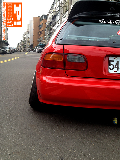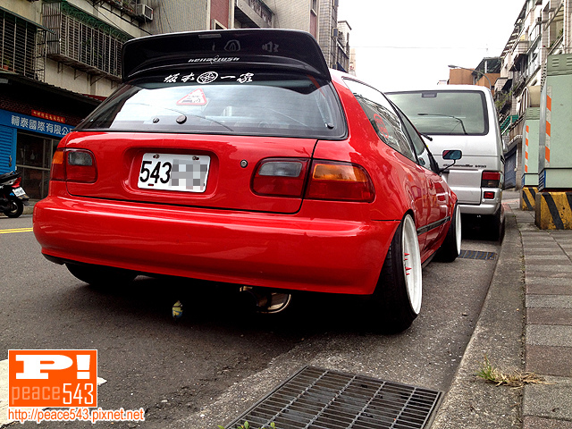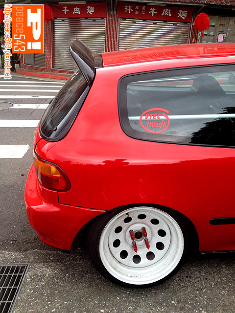 五代Civic(EG)的改裝品中,覺得挺屌的改奘品就是這個實際功效是空氣煞車的尾翼,其實還挺好看的,很像戴個棒球帽之類的。後輪真的很深,那個尖尖的輪框螺絲,讓人想到古羅馬時代的戰車(不過安全性就要小心一點啦)